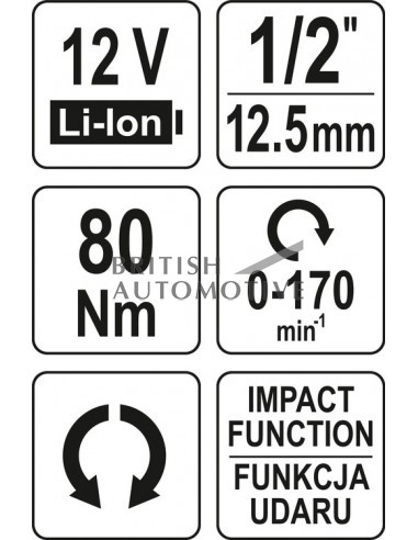 - Obsah balení: 1x Ráčna, 1x Li-Ion baterie 2Ah, 1x nabíječka, nástavce 17, 19, 21 a 23 mm, redukce 3/8“ – 1/2"
